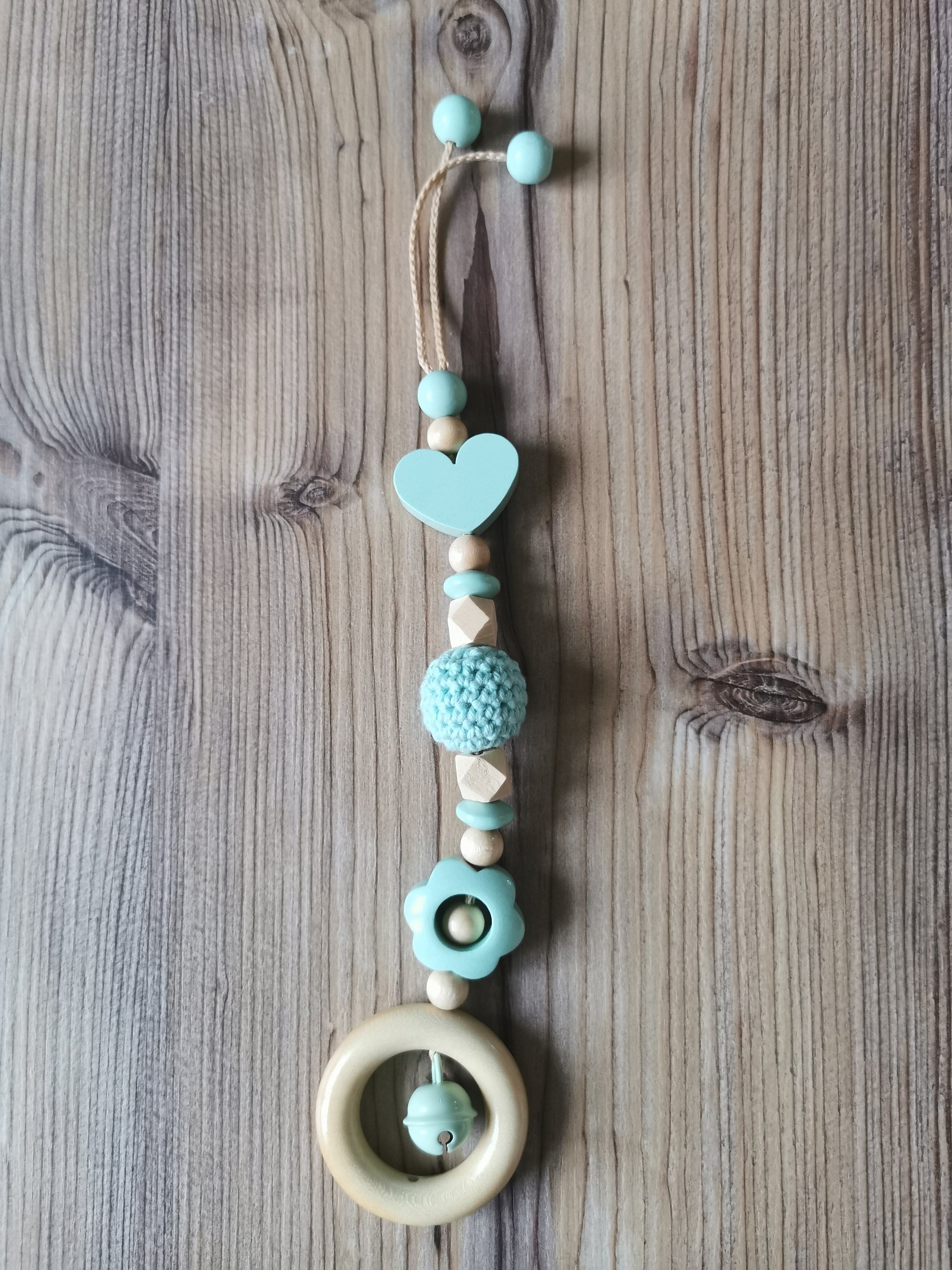 mit Herz-Motivperle, umhäkelter Holzperle, Blumenmotivperle und verschiedenen Holzperlen