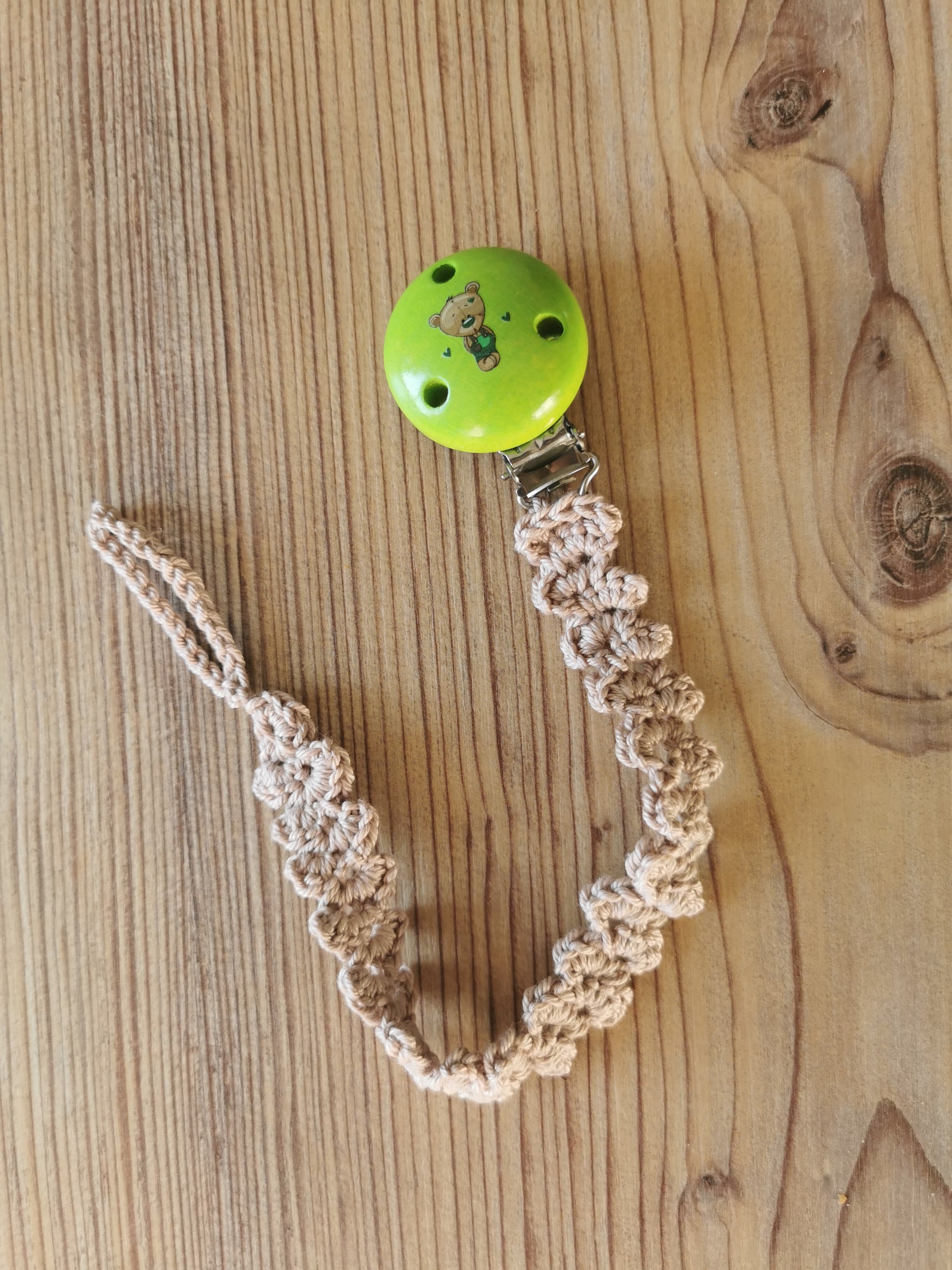 von Hand gehäkeltes Schnullerband aus hellbraunem Baumwollgarn