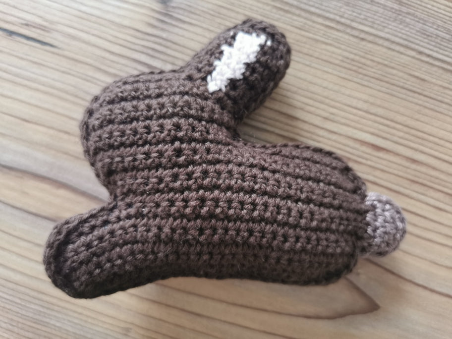 aus Baumwollgarn gehäkeltes Häschen mit eingeschlossener Rasseldose