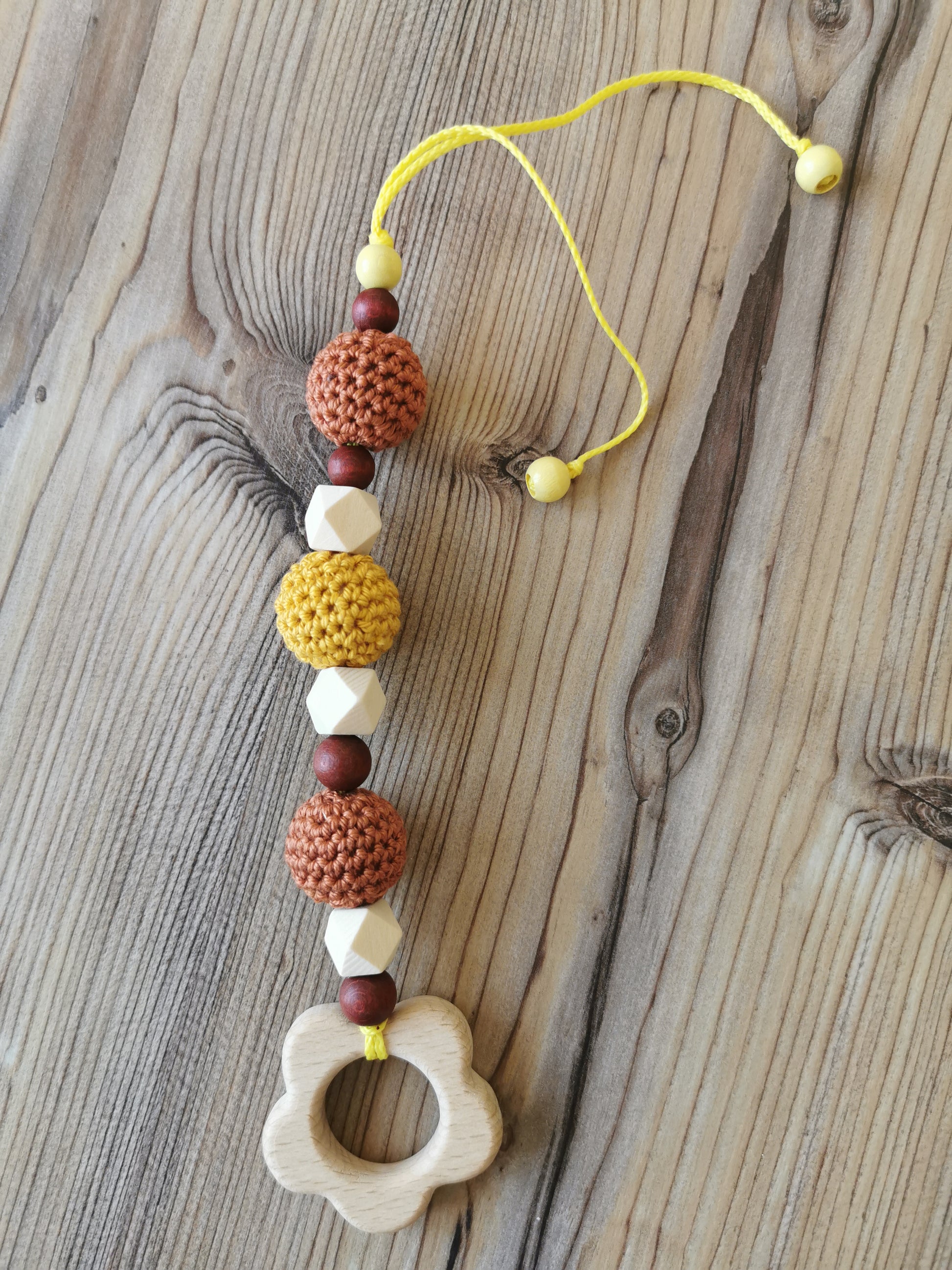 mit umhäkelten Holzperlen in den Farben Fuchs und Gelb