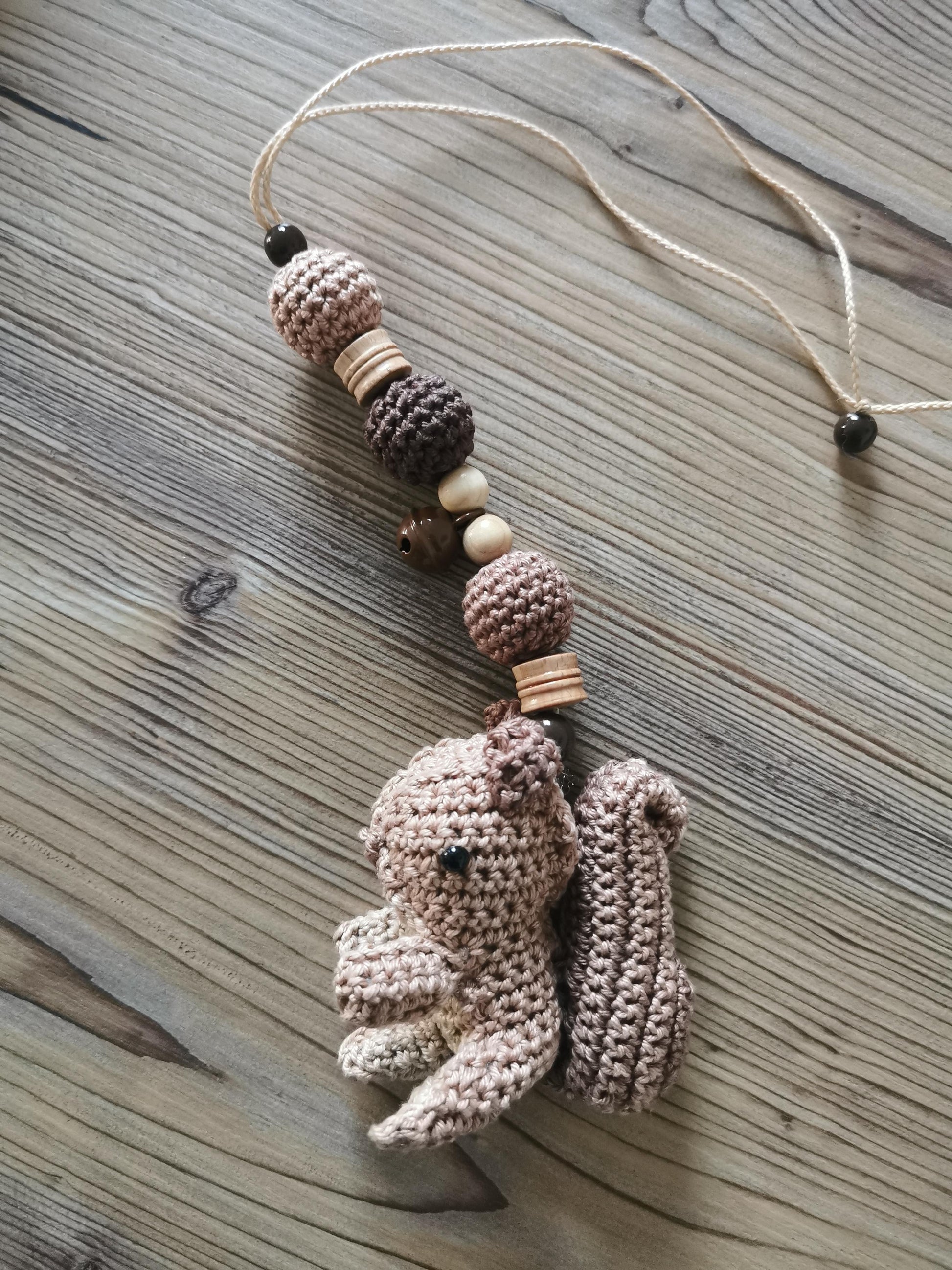 Dieser handgefertigte Maxi-Cosi-Anhänger ist nicht nur ein zuckersüßer Hingucker, sondern auch ein treuer Begleiter für unterwegs. Das niedliche gehäkelte Eichhörnchen in zarten Naturtönen wird ergänzt durch eine harmonische Kombination aus gehäkelten und Holzperlen - perfekt abgestimmt für kleine Entdeckerhände. Mit den praktischen Bändern lässt sich er der Anhänger ganz einfach am Babyschalen-Griff. am Kinderwagen oder am Autositz befestigen.