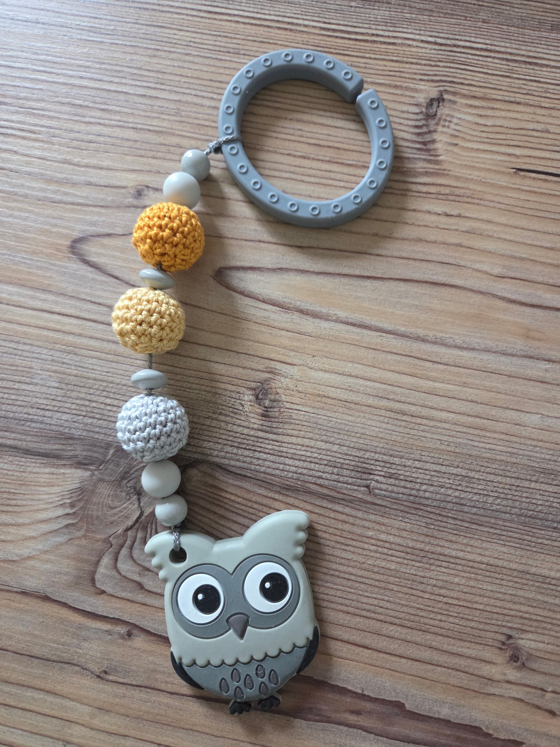 Dieser wunderschöne Anhänger für Babyschale oder Kinderwagen ist nicht nur ein echter Hingucker, sondern regt mit seinen unterschiedlichen Formen, Materialien und Farben auch Babys Sinne an. Die Silikoneule ist ein praktischer Beißring für unterwegs.