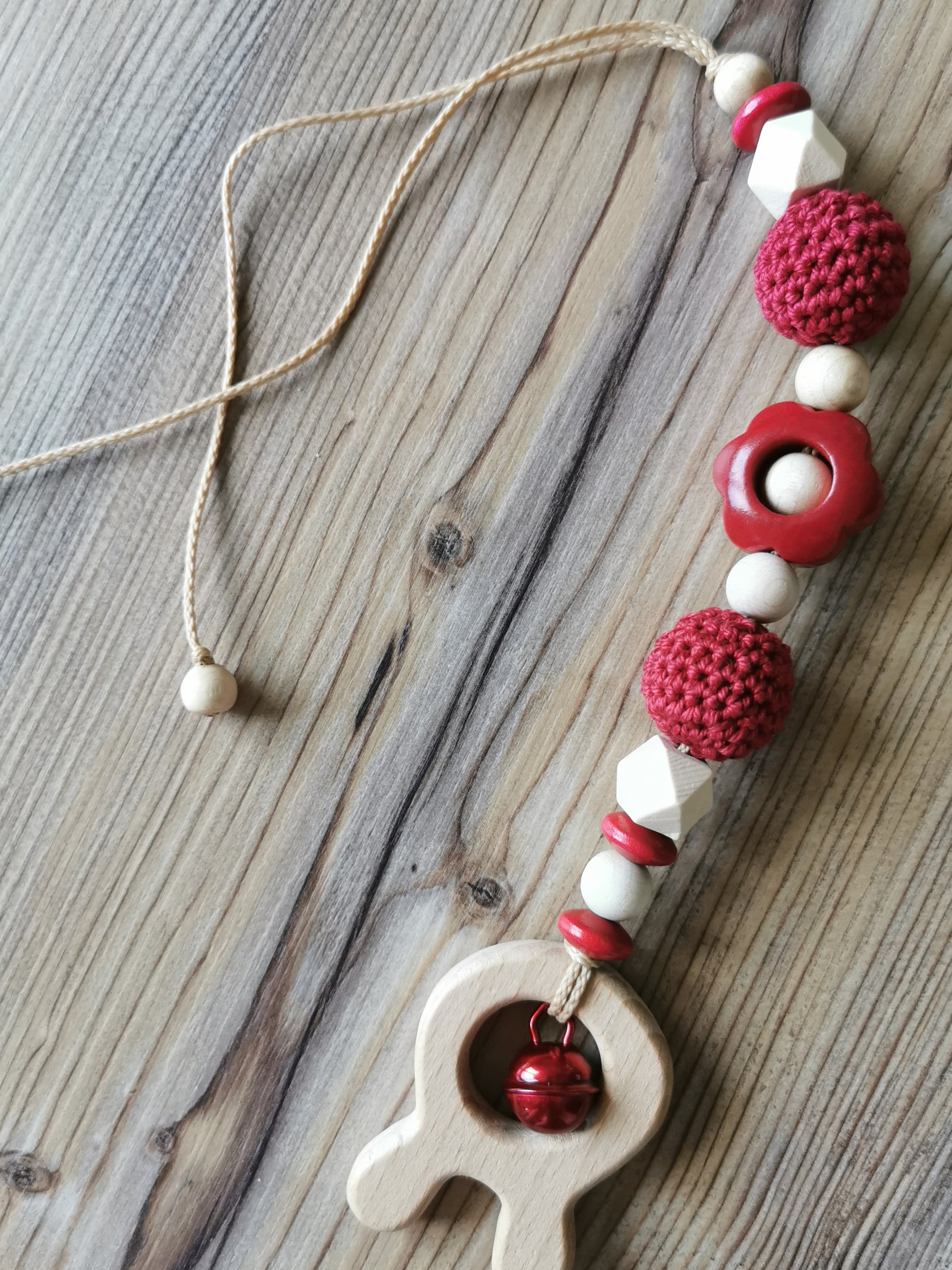 mit einem Häschen-Anhänger aus Holz (Beißring!), Blumen-Motivperle, einem kleinen Glöckchen und umhäkelten Holzperlen