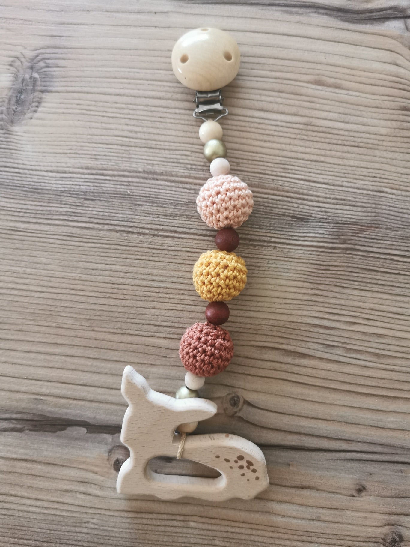 + umhäkelte Holzperlen in Rose, Gelb und Fuchs