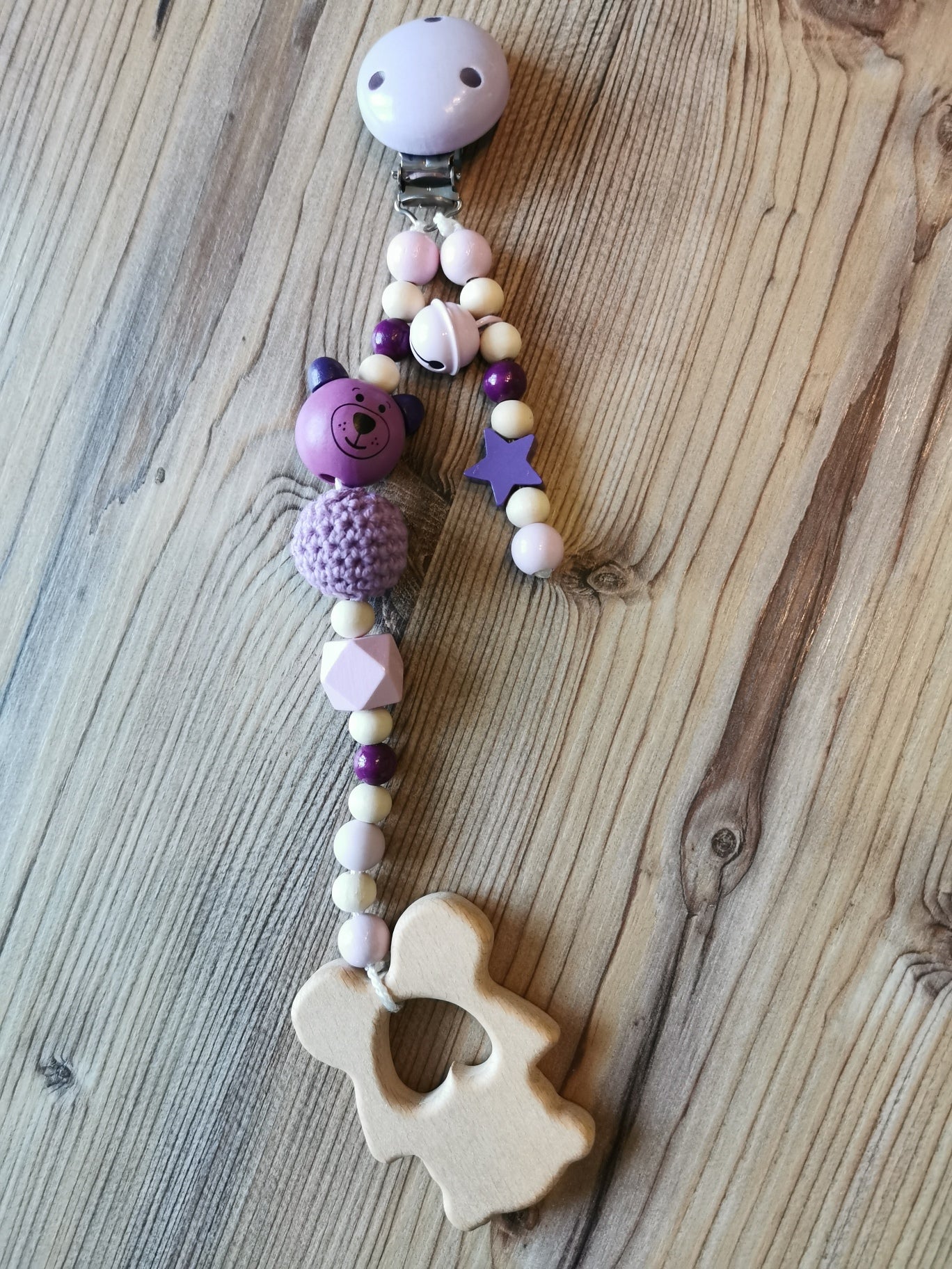mit Holz-Beißanhänger (Teddy), Teddy-3D-Perle, kleinem Glöckchen, Sternmotivperle und verschiedenen Holz- und Silikonperlen