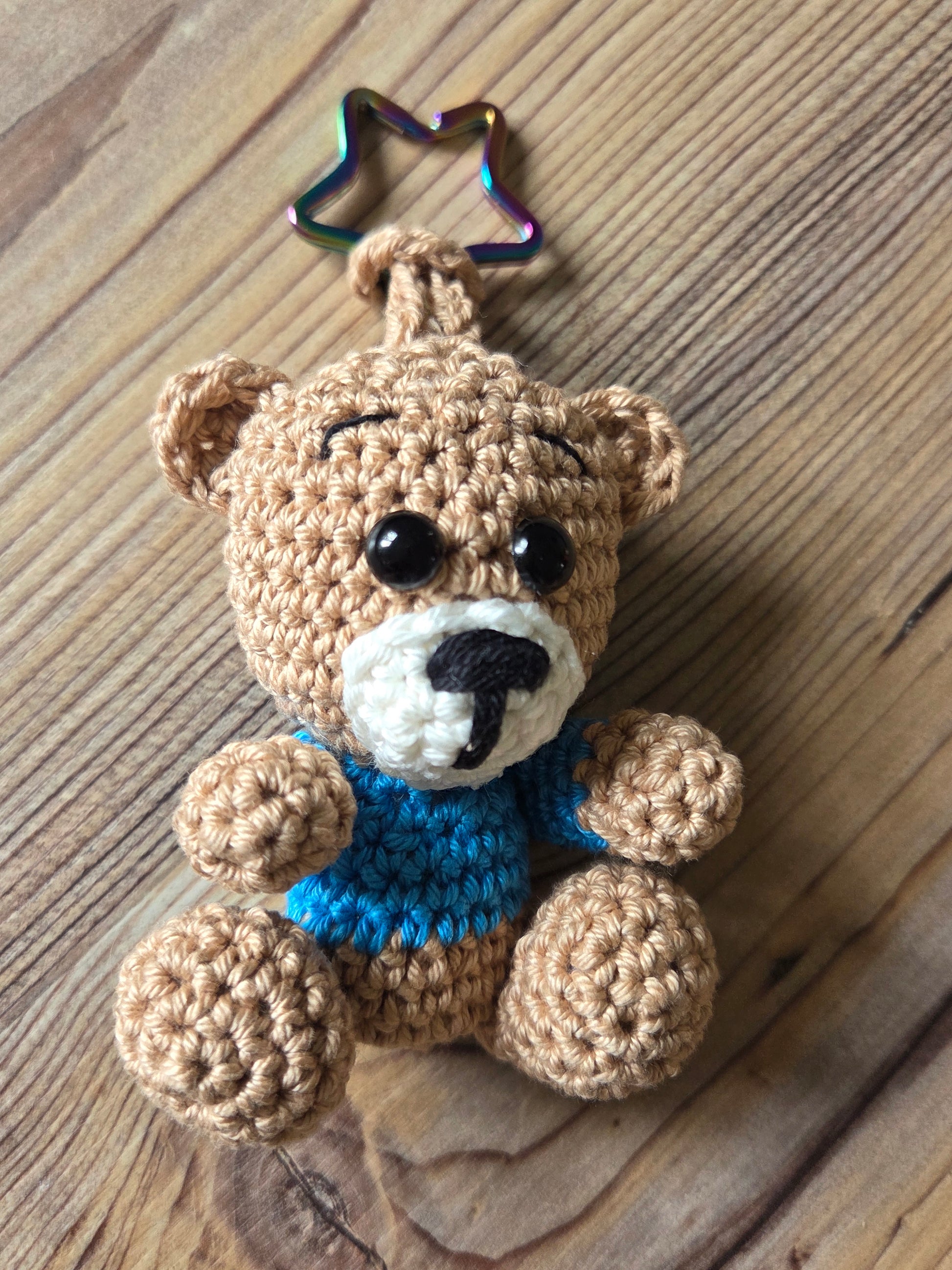 Dieser ca. 8cm große, niedliche Mini-Teddy wurde mit viel Liebe zum Detail aus weichem Baumwollgarn gehäkelt.