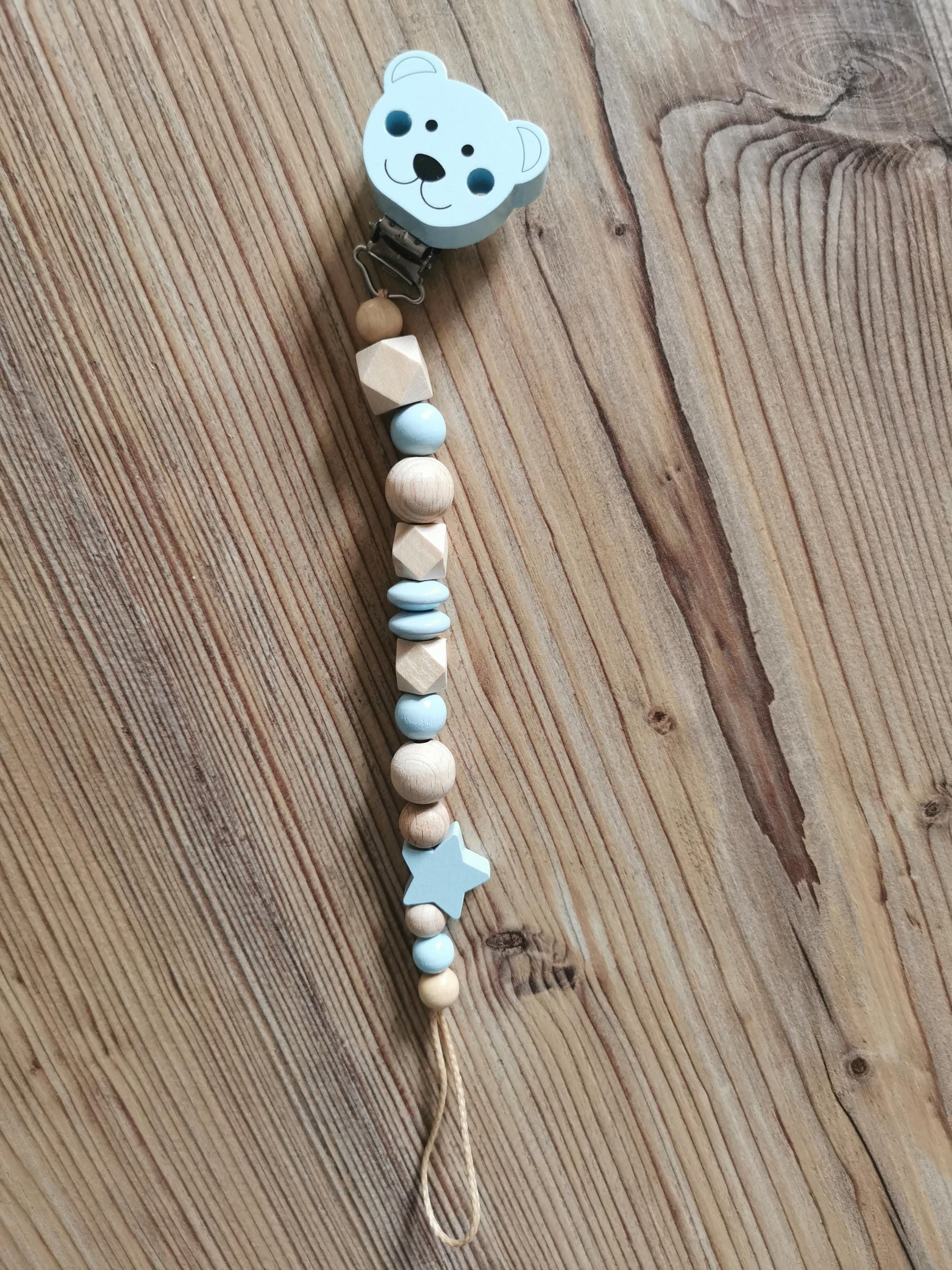 Material: Holzperlen & Silikonperlen ( speichelfest), Clip mit Bärenkopf
