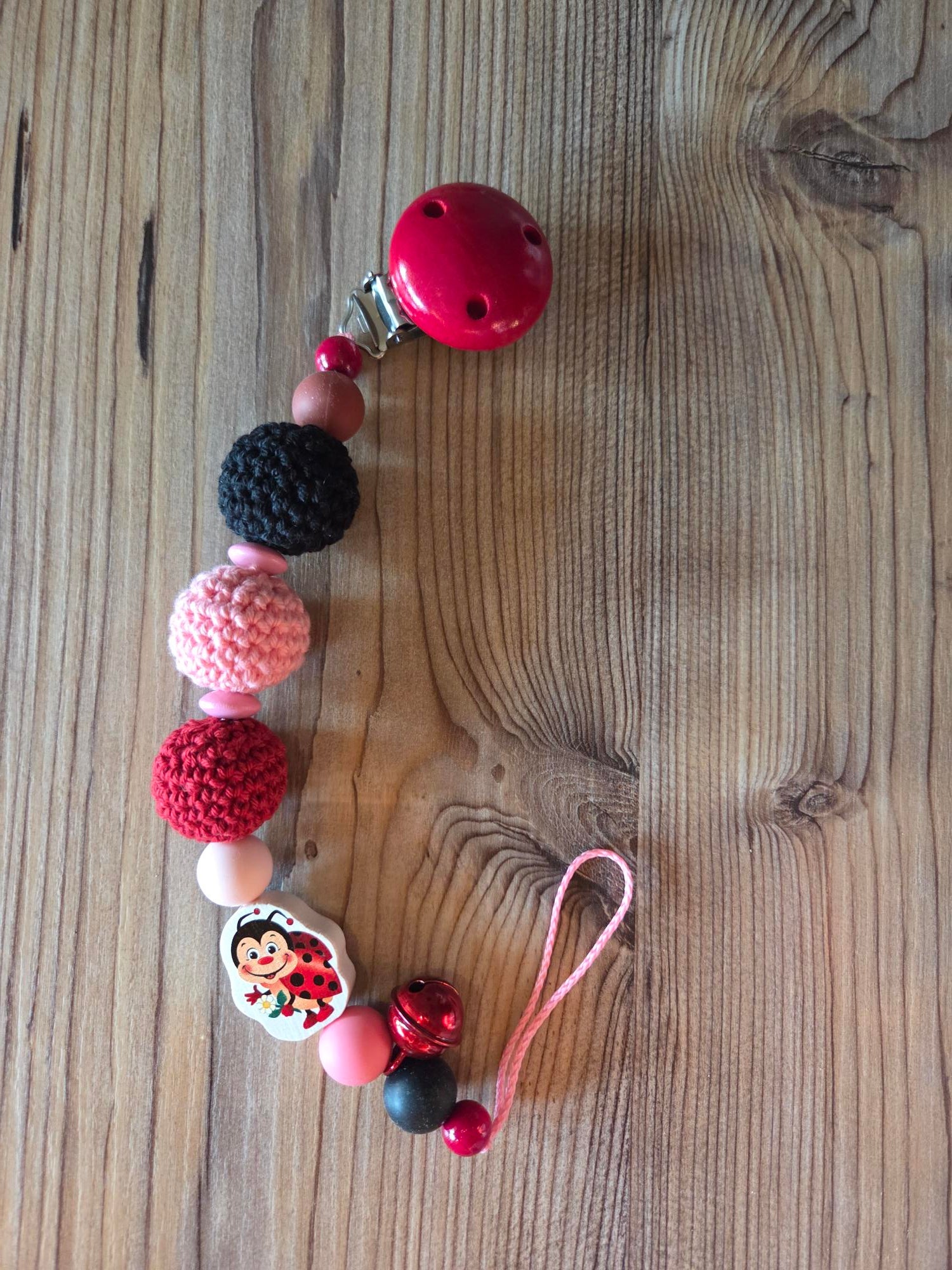 + umhäkelte Holzperlen, rotem Befestigungsclip aus Holz, und Holz- sowie Silikonperlen