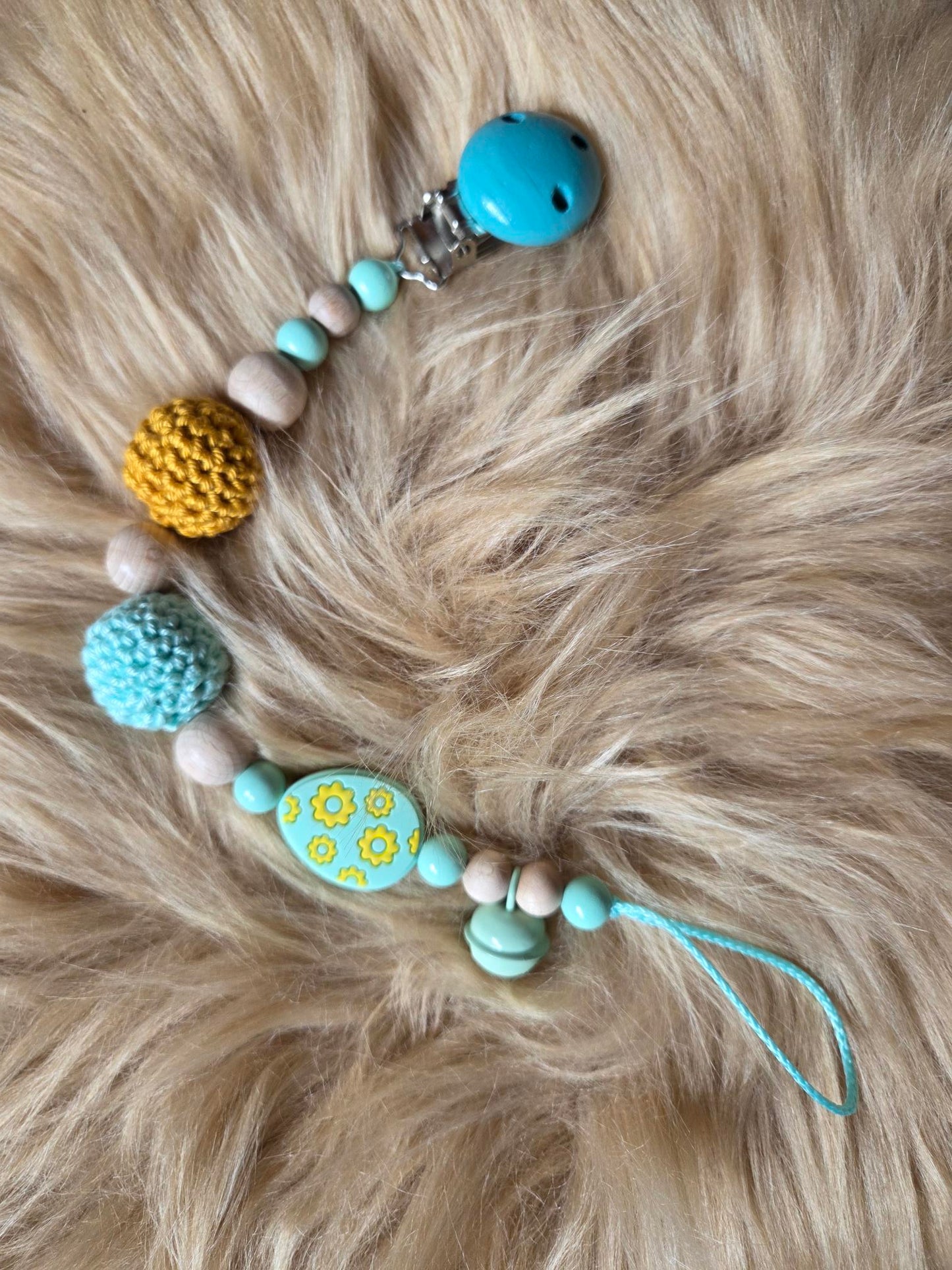 Schnullerkette mit Befestigungsclip, Silikonosterei und kleinem Glöckchen
